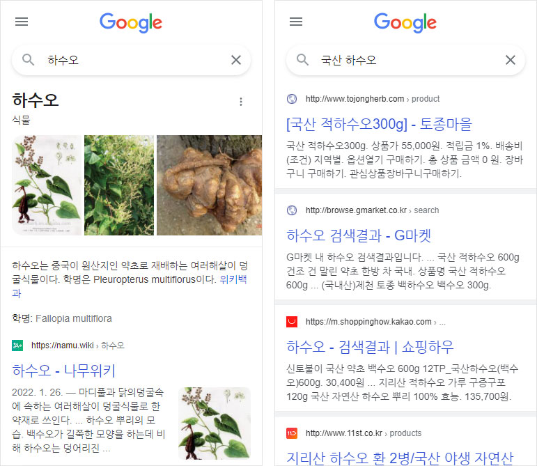 ‘하수오’도 연구의도와 구매의도가 혼재하지만 앞에 ‘국산’을 붙이면 구매의도가 됩니다.