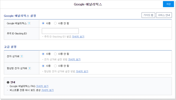 카페24나 워드프레스, shopify, wix 등 쇼핑몰 기능을 지원하는 솔루션에는 GA 추적 ID를 입력하는 것만으로 GA 기본 추적과 전자상거래 설정이 가능한 경우가 있습니다.